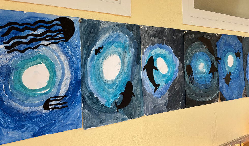 Die 3. Klasse ist kreativ in die Unterwasserwelt eingetaucht: Mit Wasserfarben und Salz entstanden spannende Strukturen, die an schimmerndes Wasser und Wellen erinnern. Ergänzt wurden die Bilder durch Schatten von Meerestieren – so sind beeindruckende Unterwasser-Kunstwerke entstanden.